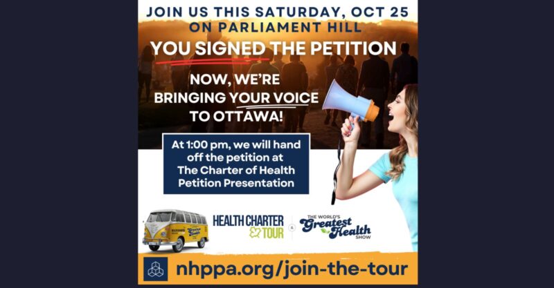 Join the National Health Product Protection Assn (NHPPA) this Saturday, Oct. 25th on Parliament Hill in Ottawa for the “Ceremony for the Charter of Health.”