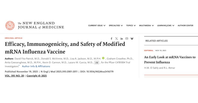 The following summary outlines the major findings from Efficacy, Immunogenicity, and Safety of Modified mRNA Influenza Vaccine, a Phase 3 trial of Pfizer’s modified mRNA influenza vaccine, published in The New England Journal of Medicine (NEJM). It presents the study design, participant characteristics, reported efficacy and documented adverse events exactly as described in the NEJM article and its supplementary materials. This overview is being shared to help readers understand the key data and limitations of the trial.