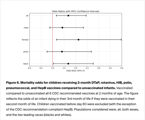 • +68% higher odds of death overall among infants receiving all six recommended 2-month vaccines