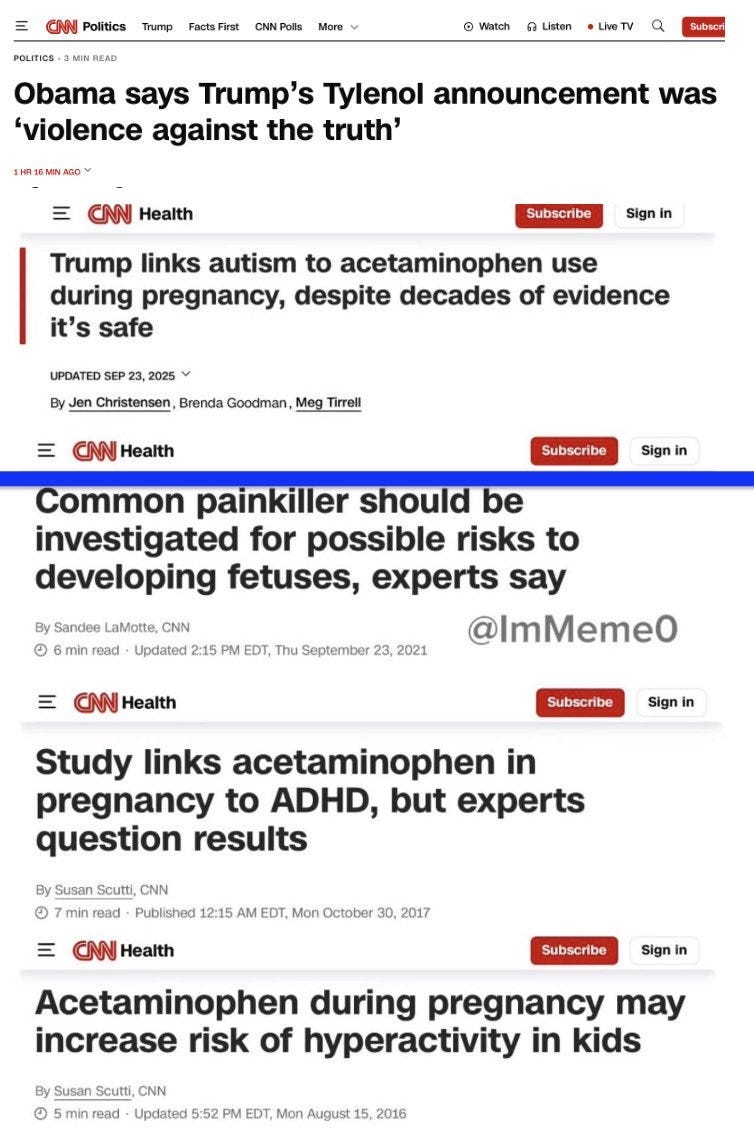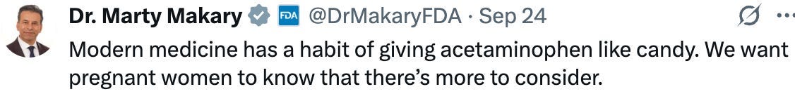 Note: regrettably, to show they believed in “Science”, pregnant mothers began quickly posting videos of themselves taking large amounts of Tylenol (which I compiled on 𝕏 here—including a tragic overdose).